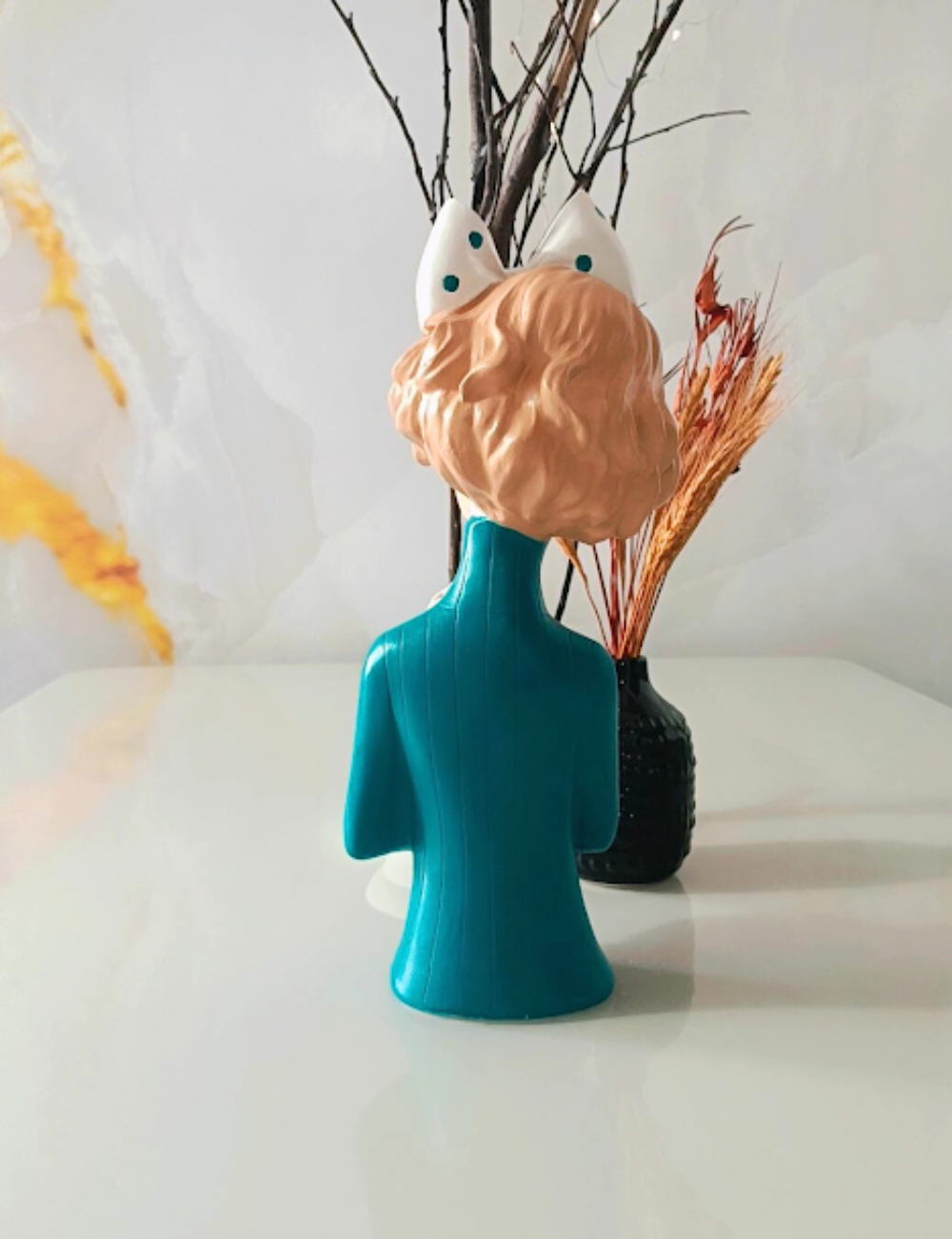 O laço na cabeça é pintado com charme e atenção aos detalhes, reforçando a beleza da peça.